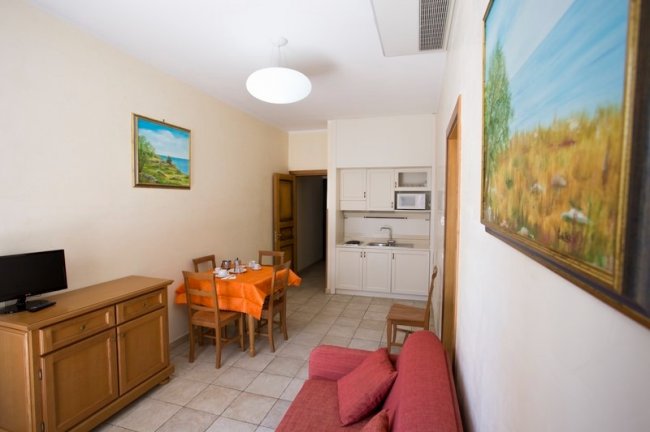 bilocale in muratura; primo piano; aria condizionata; area giorno con angolo cottura (due piastre elettriche); frigo; tv-LCD; 1 camera con letto matrimoniale; divano letto singolo in area giorno; bagno con cabina doccia idromassaggio e bidet. Balcone.
